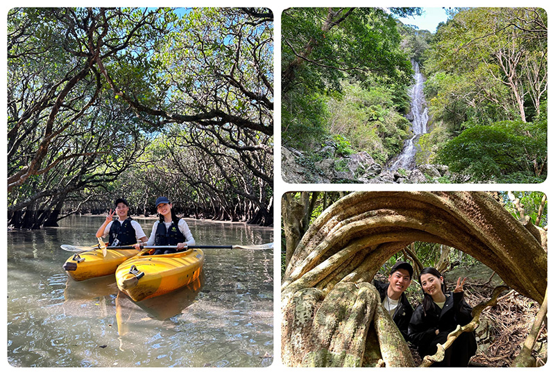 ウミガメと泳ぐシュノーケル、マングローブカヌー、モダマ自生地またはフナンギョの滝の3箇所を巡る1Dayプラン。